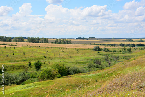 © Irina, Fototapeta premium a valley with fields and trees and a sky with clouds