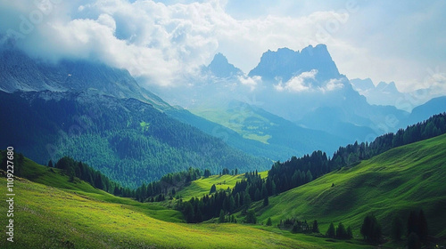 © Nature_Beauty, Fototapeta premium A valley with lush green hills and mountains