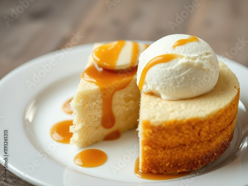 Fototapeta premium A vanilla sponge cake topped with a scoop of creamy ice cream and caramel...