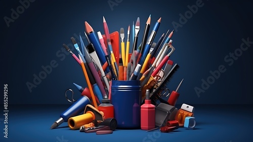 © BozStock, Obraz premium A variety of art supplies are arranged in a blue container on a blue background.