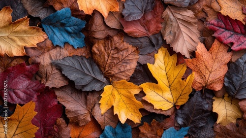 Fototapeta premium A variety of autumn leaves in rich hues of yellow, orange, red, brown, and blue are laid out on the forest floor, showcasing the beauty of fall foliage in a natural setting