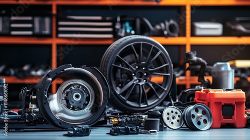 © Nure, Fototapeta premium A variety of car equipment and spare parts, featuring a wheel and turbocharger