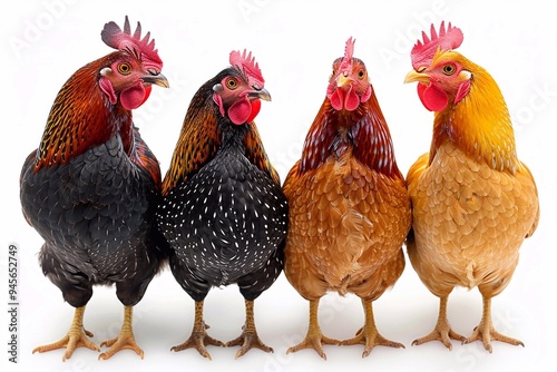 Fototapeta premium A variety of chickens in a lush green meadow, showcasing different breeds and...