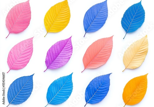Obraz premium A variety of clear silhouettes of delicate leaf skeletons set against a multicolored background of blue, violet, lilac, and pink. A floral pattern showcasing stunning leaves in a nature macro