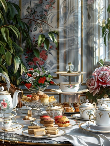 © burntime555, Fototapeta premium A variety of colorful desserts spread across a table topped with a white tablecloth.