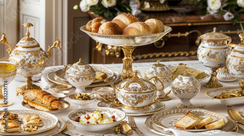 Naklejka premium A variety of colorful dishes fill a large dining table, showcasing a feast of...