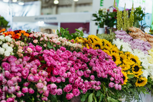 © Irina Polonina, Fototapeta premium A variety of colorful fresh flowers at the flower fair. Spring sale. Colorful nature background.