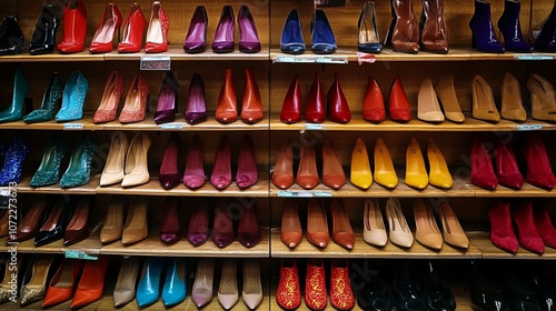 © Koplexs-Stock, Fototapeta premium A Variety of High-Heeled Shoes on Wooden Shelves