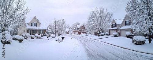 © Samina, Obraz premium A variety of homes under a blanket of snow on a suburban street.