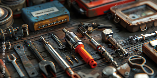 © Umair, Fototapeta premium A Variety of Tools Including Wrenches and Sockets Scattered on a Workbench Showcasing Rust and Wear Against a Rustic Background.