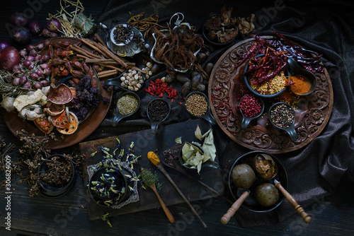 © K.Pornsatid, Fototapeta premium A variety spices and herbs in wooden bowls, Of Asians For cooking.