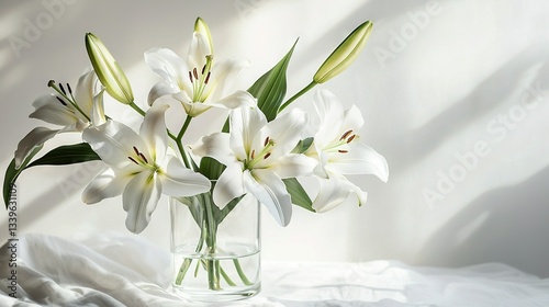 Fototapeta premium A vase filled with white flowers rests on a white tablecloth, casting a...