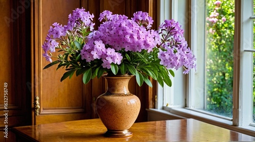 © Png, Fototapeta premium A vase of purple flowers sits on a wooden table by a window