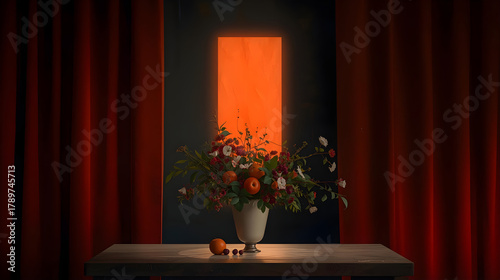 © Kinan Nurdiansyah, Fototapeta premium a vase with flowers and oranges on a table