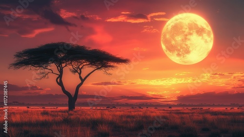 © savittree, Fototapeta premium A vast African savanna with an acacia tree in the distance, under a vibrant sunset and a giant moon casting a soft glow