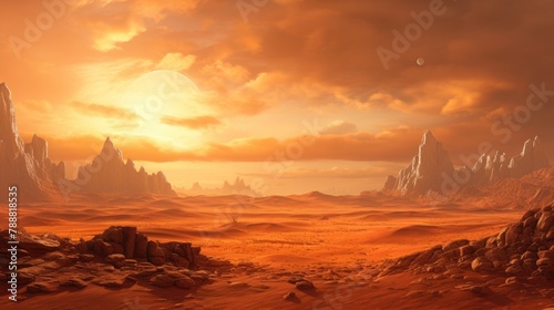 Naklejka premium A vast and desolate desert landscape with a large sun in the distance,...