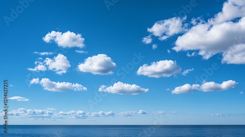 © Generative AI, Obraz premium A vast blue sky scattered with fluffy white clouds reflecting over a tranquil ocean at daytime : Generative AI