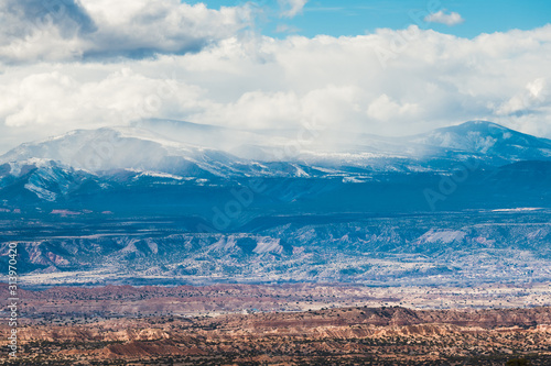 Obraz premium A vast colorful desert landscape under snow-capped mountains and winter storm...