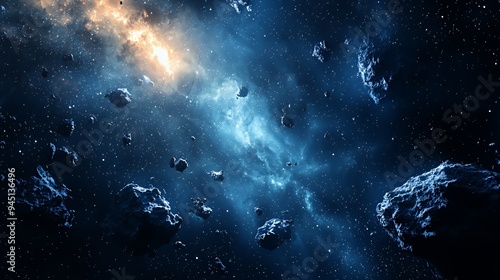 © kinara art design, Fototapeta premium A vast cosmic scene featuring asteroids and a colorful nebula in deep space.