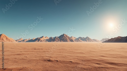 Fototapeta premium A vast desert landscape with distant mountains under a clear blue sky and a bright sun shining above.