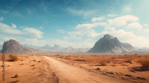 Naklejka premium A vast desert landscape with mountains and a winding dirt road under a clear...