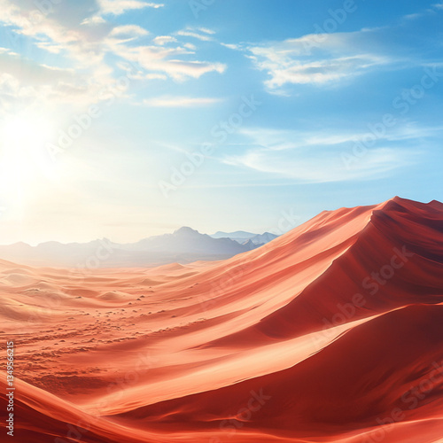 © Sadia, Fototapeta premium A vast desert landscape with rolling sand dunes under a bright blue sky and distant mountain range