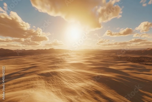 © Ruslan, Fototapeta premium A vast desert landscape with rolling sand dunes under a brilliant sunset