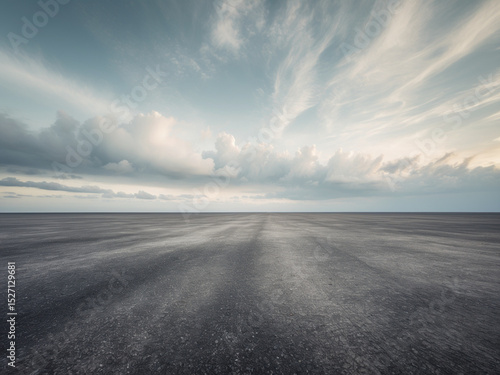© HooSv, Fototapeta premium A vast, empty asphalt road stretching to the horizon under a dramatic, cloudy sky, creating a sense of openness and journey.