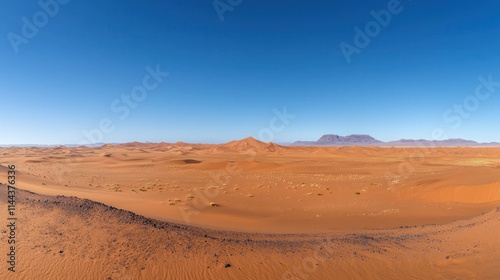 © Seak, Naklejka premium A vast, empty desert with endless sand dunes stretching to the horizon under a clear blue sky