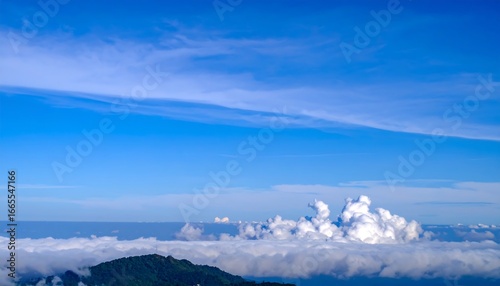 Fototapeta premium A vast expanse of a vibrant blue sky, dotted with fluffy white clouds, stretches above a sea of clouds, showcasing a majestic vista.