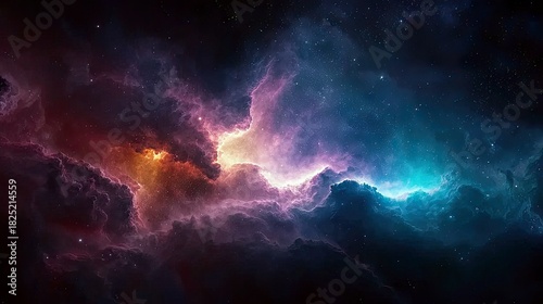 © Banawi, Fototapeta premium A vast expanse of colorful nebula clouds, glowing with vibrant oranges, pinks, and blues, dotted with distant stars in the darkness of deep space.