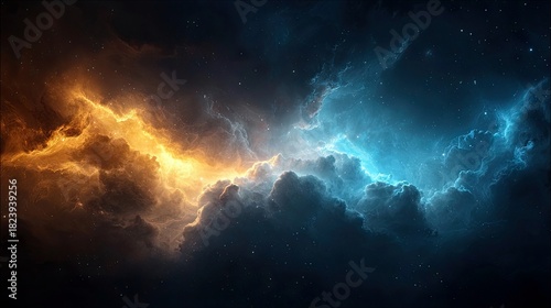 © sudirmanginanjarirga, Obraz premium A vast expanse of deep space filled with swirling cosmic clouds. One side glows with intense fiery orange light, while the other is illuminated by vibrant elect