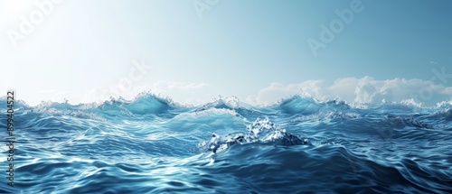 © Mikus, Fototapeta premium A vast expanse of water teems with waves, their crests reaching for the vibrant blue sky above