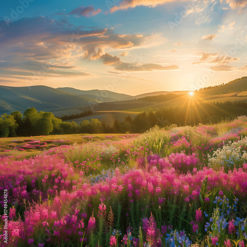 Fototapeta premium A vast field of flowers stretches as far as the eye can see, bursting with...