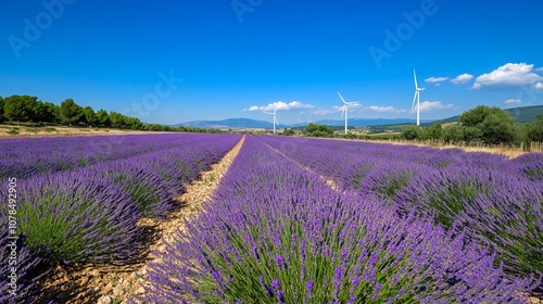 © siyons, Naklejka premium A vast field of purple lavender flowers blooms under a clear blue sky with wind turbines in the distance.