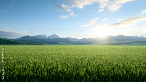 Fototapeta premium A vast field of vibrant green grass stretches beneath a clear blue sky