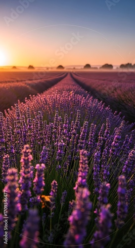 © Pangeran, Fototapeta premium A vast field of vibrant purple lavender blossoms stretches out beneath a golden sunrise, creating a serene and picturesque landscape.