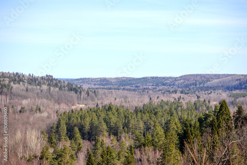 © Jorens, Fototapeta premium A vast forested landscape with various trees and clear skies.