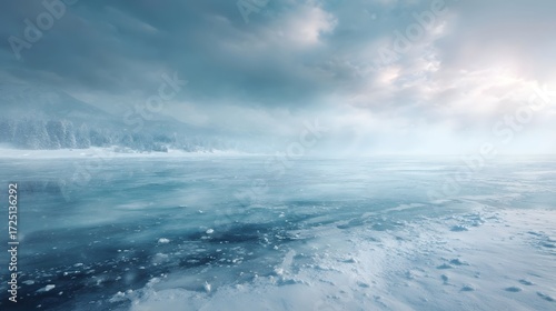 © Bussakon, Fototapeta premium A vast frozen lake stretches towards a snow covered shoreline under a dramatic cloudy winter sky