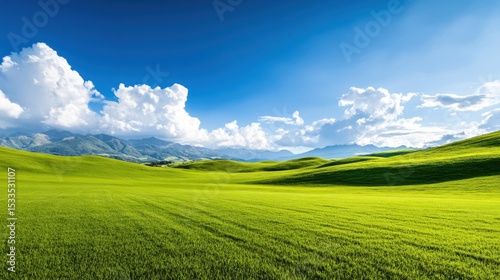 Obraz premium A vast, green empty pastureland with gentle rolling hills and distant mountains under a bright sunny sky.