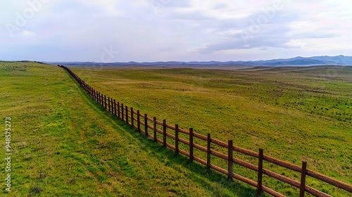 Fototapeta premium A vast green landscape with a wooden fence stretching across the horizon...
