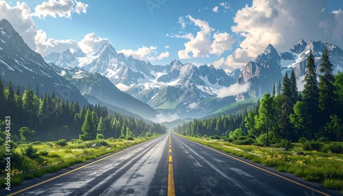 © allea, Fototapeta premium A vast highway stretching to snow-capped mountains under a blue sky