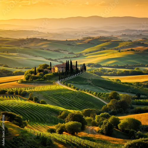 Naklejka premium a vast hilly area used for vineyards and farmhouses at sunset