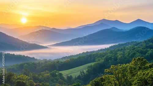 © MarinkaLev, Obraz premium A vast mountain range under golden sunrise light, mist rolling through valleys, epic natural beauty, adventure, peace