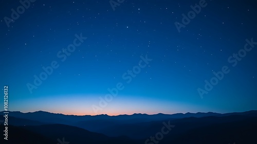 © Genta, Fototapeta premium A vast night sky with a few stars and a faint sunrise over a mountain range.