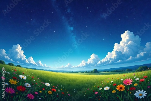 Obraz premium A vast open field with wildflowers and a bright blue sky under a starry night, sky, clouds, open