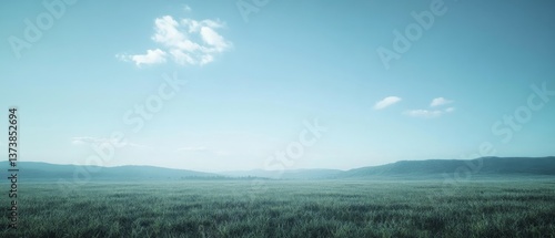 Fototapeta premium A vast, open grassy field stretches under a bright azure sky, encapsulating...
