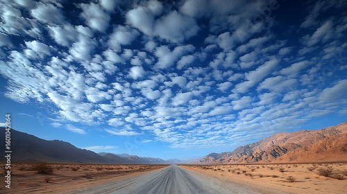 Fototapeta premium A vast, open road stretches into a sky filled with a multitude of cumulus...