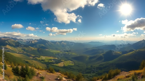 © urbanpics, Naklejka premium A vast panoramic view of a beautiful mountain range under a bright blue sky with fluffy white clouds.