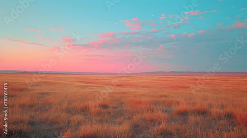Obraz premium A vast plain, with surreal neon-colored grass and a pastel gradient sky,...